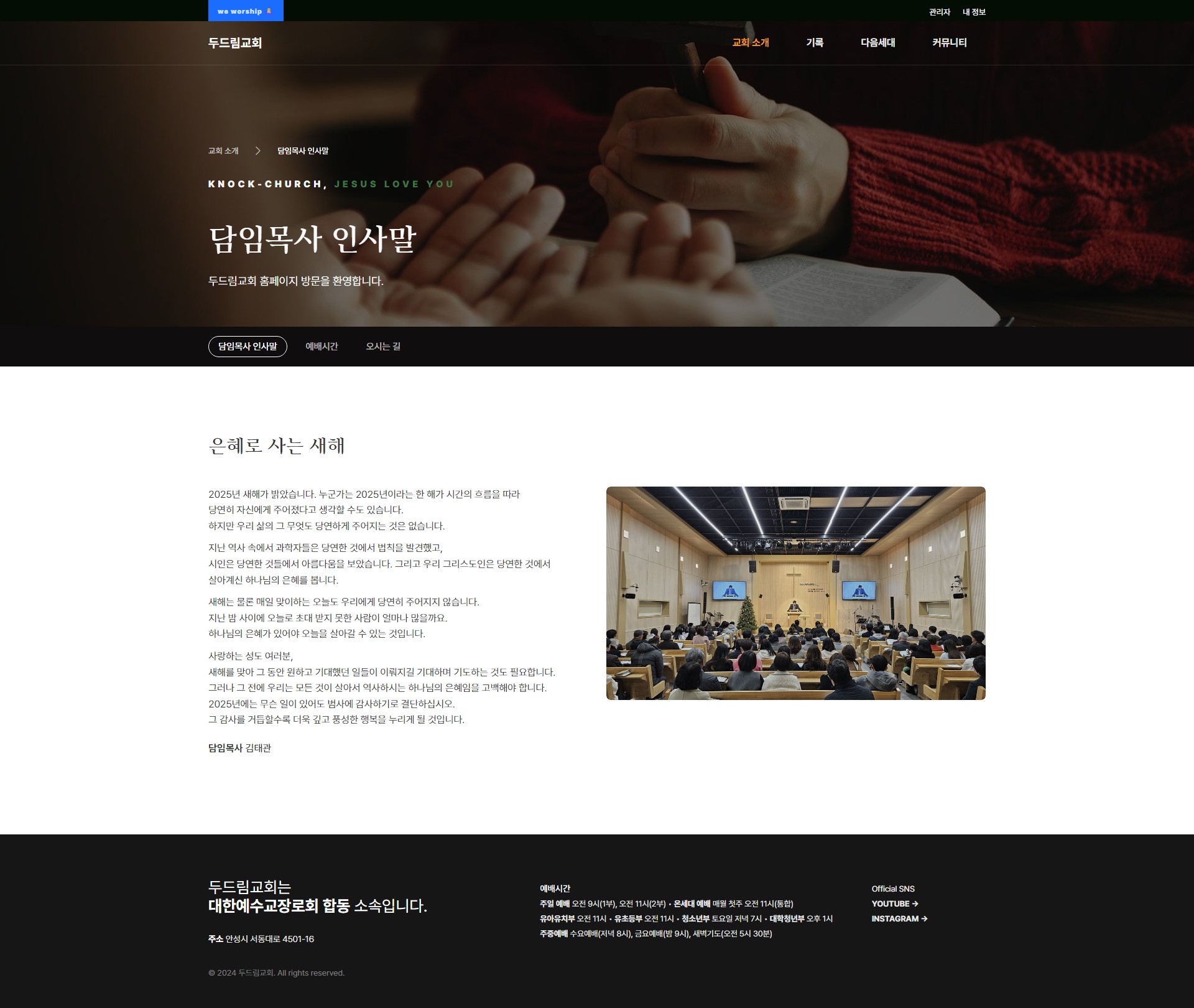 [서브 : 교회 소개 > 담임목사 인사말, 예배 안내, 오시는 길]
