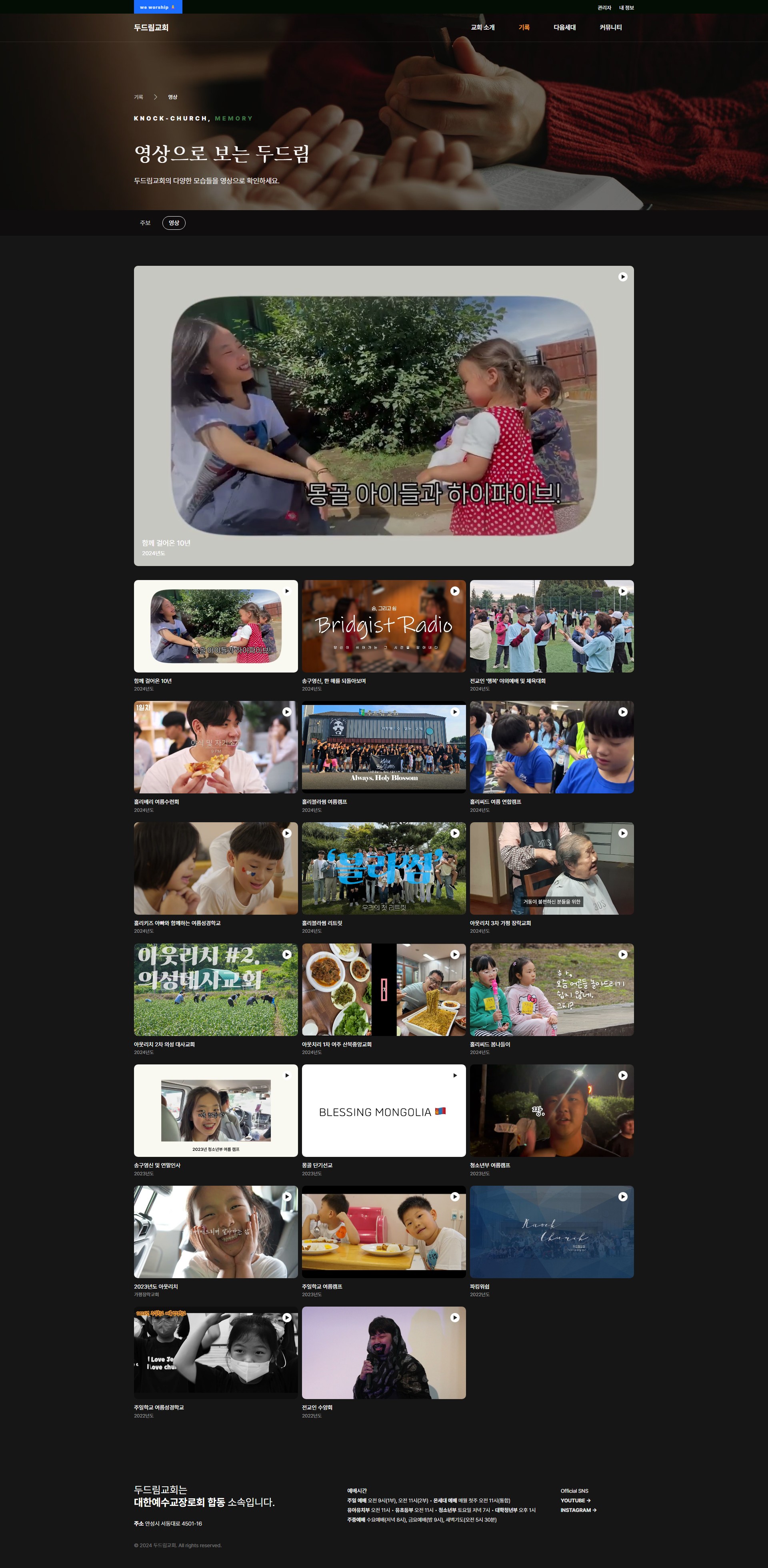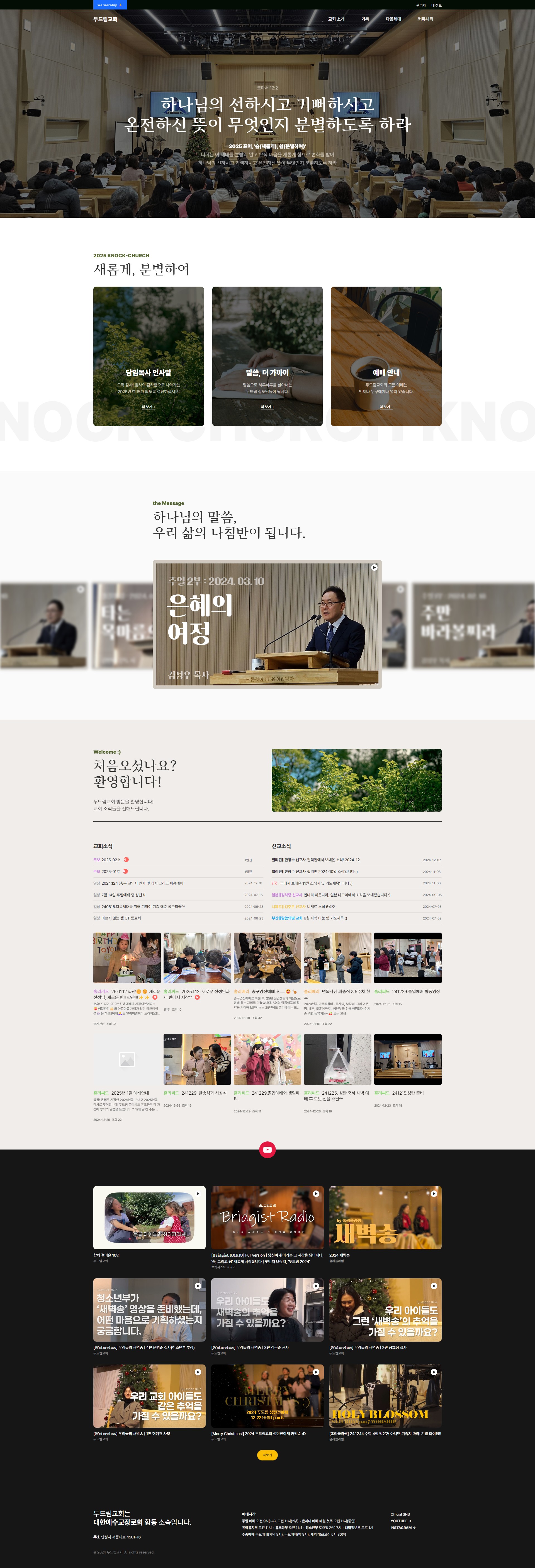 익숙한 콘텐츠들로 구성하였고, 마지막 섹션에는 영상을 많이 찍는 만큼 유튜브처럼 영상들을 나열하여 두드림교회를 궁금해 하시고 관심을 갖고 계신 분들에게 좀 더 교회를 들여다 보실 수 있도록 하였습니다.
